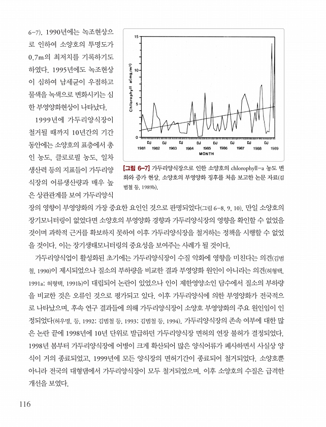 116 6-7 1990년에는 녹조현상으 로 인하여 소양호의 투명도가 0.7m의 최저치를 기록하기도 하였다. 1995년에도 녹조현상 이 심하여 남세균이 우점하고 물색을 녹색으로 변화시키는 심 한 부영양화현상이 나타났다. 1999년에 가두리양식장이 철거될 때까지 10년간의 기간 동안에는 소양호의 표층에서 총 인 농도, 클로로필 농도, 일차 생산력 등의 지표들이 가두리양 식장의 어류생산량과 매우 높 은 상관관계를 보여 가두리양식 장의 영향이 부영양화의 가장 중요한 요인인 것으로 판명되었다 그림 6-8, 9, 10 만일 소양호의 장기모니터링이 없었다면 소양호의 부영양화 경향과 가두리양식장의 영향을 확인할 수 없었을 것이며 과학적 근거를 확보하지 못하여 이후 가두리양식장을 철거하는 정책을 시행할 수 없었 을 것이다....