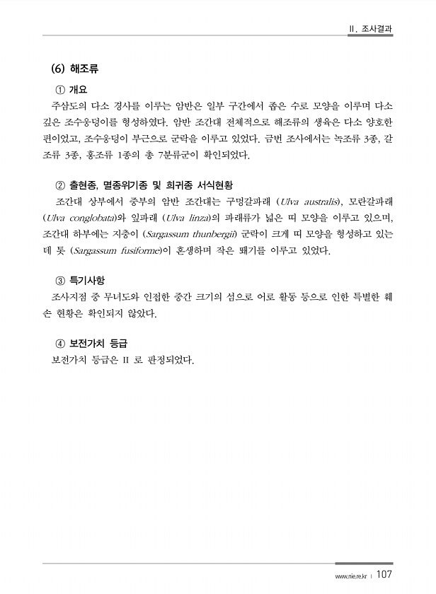 Ⅱ. 조사결과 www.nie.re.kr ? 107 6 해조류 ① 개요 주삼도의 다소 경사를 이루는 암반은 일부 구간에서 좁은 수로 모양을 이루며 다소 깊은 조수웅덩이를 형성하였다. 암반 조간대 전체적으로 해조류의 생육은 다소 양호한 편이었고, 조수웅덩이 부근으로 군락을 이루고 있었다. 금번 조사에서는 녹조류 3종, 갈 조류 3종, 홍조류 1종의 총 7분류군이 확인되었다. ② 출현종, 멸종위기종 및 희귀종 서식현황 조간대 상부에서 중부의 암반 조간대는 구멍갈파래 Ulva australis , 모란갈파래 Ulva conglobata 와 잎파래 Ulva linza 의 파래류가 넓은 띠 모양을 이루고 있으며, 조간대 하부에는 지충이 Sargassum thunbergii 군락이 크게 띠 모양을 형성하고 있는 데 톳 ...