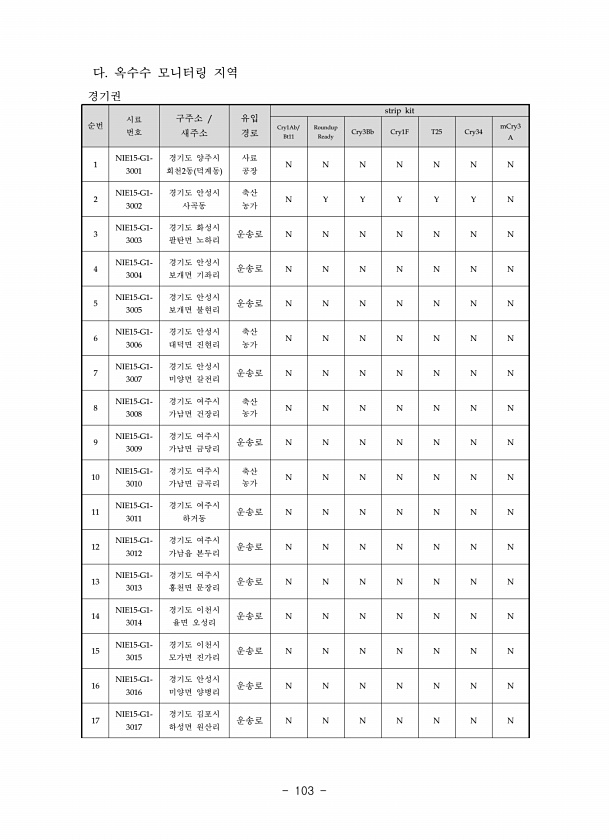경기권 순번 시료 번호 구주소 새주소 유입 경로 strip kit Cry1Ab/ Bt11 Roundup Ready Cry3Bb Cry1F T25 Cry34 mCry3 A 1 NIE15-G1- 3001 경기도 양주시 회천2동 덕계동 사료 공장 N N N N N N N 2 NIE15-G1- 3002 경기도 안성시 사곡동 축산 농가 N Y Y Y Y Y N 3 NIE15-G1- 3003 경기도 화성시 팔탄면 노하리 운송로 N N N N N N N 4 NIE15-G1- 3004 경기도 안성시 보개면 기좌리 운송로 N N N N N N N 5 NIE15-G1- 3005 경기도 안성시 보개면 불현리 운송로 N N N N N N N 6 NIE15-G1- 3006 경기도 안성시 대덕면 진현리 축산 농가 N N N N N ...