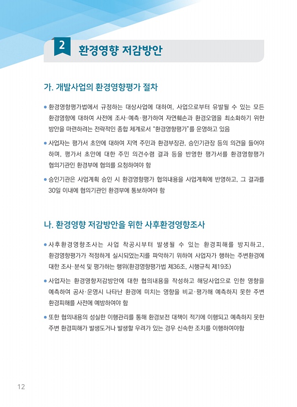 12 가. 개발사업의 환경영향평가 절차 ● 환경영향평가법에서 규정하는 대상사업에 대하여, 사업으로부터 유발될 수 있는 모든 환경영향에 대하여 사전에 조사·예측·평가하여 자연훼손과 환경오염을 최소화하기 위한 방안을 마련하려는 전략적인 종합 체계로서 “환경영향평가”를 운영하고 있음 ● 사업자는 평가서 초안에 대하여 지역 주민과 환경부장관, 승인기관장 등의 의견을 들어야 하며, 평가서 초안에 대한 주민 의견수렴 결과 등을 반영한 평가서를 환경영향평가 협의기관인 환경부에 협의를 요청하여야 함 ● 승인기관은 사업계획 승인 시 환경영향평가 협의내용을 사업계획에 반영하고, 그 결과를 30일 이내에 협의기관인 환경부에 통보하여야 함 나. 환경영향 저감방안을 위한 사후환경영향조사 ● 사후환경영향조사는 사업 착공시부터 발생될...