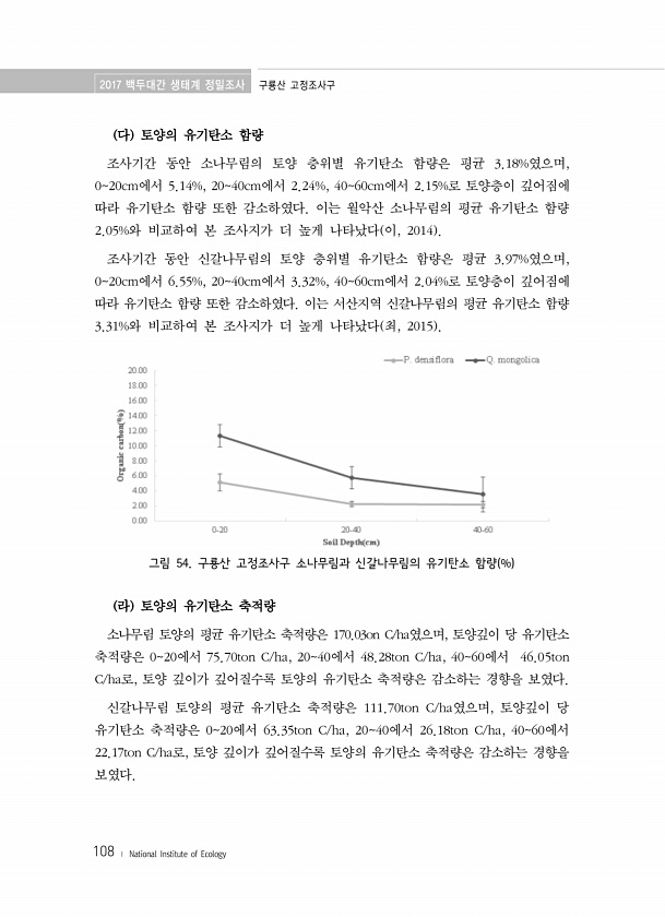 2017 백두대간 생태계 정밀조사 구룡산 고정조사구 108 ? National Institute of Ecology 다 토양의 유기탄소 함량 조사기간 동안 소나무림의 토양 층위별 유기탄소 함량은 평균 3.18%였으며, 020cm에서 5.14%, 2040cm에서 2.24%, 4060cm에서 2.15%로 토양층이 깊어짐에 따라 유기탄소 함량 또한 감소하였다. 이는 월악산 소나무림의 평균 유기탄소 함량 2.05%와 비교하여 본 조사지가 더 높게 나타났다 이, 2014 조사기간 동안 신갈나무림의 토양 층위별 유기탄소 함량은 평균 3.97%였으며, 020cm에서 6.55%, 2040cm에서 3.32%, 4060cm에서 2.04%로 토양층이 깊어짐에 따라 유기탄소 함량 또한 감소하였다. 이는 서산지역 신갈나무림의 평균...