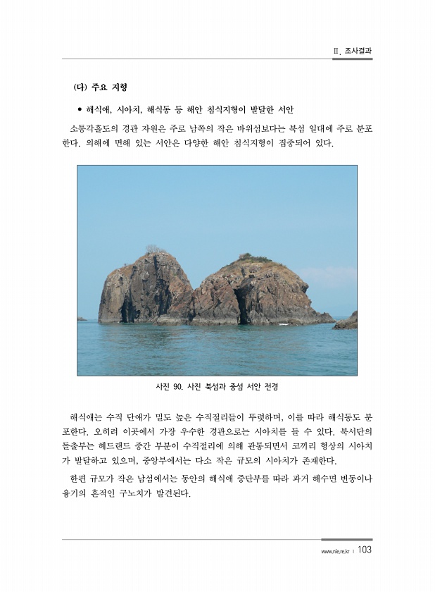 Ⅱ. 조사결과 www.nie.re.kr ? 103 다 주요 지형 ? 해식애, 시아치, 해식동 등 해안 침식지형이 발달한 서안 소통각흘도의 경관 자원은 주로 남쪽의 작은 바위섬보다는 북섬 일대에 주로 분포 한다. 외해에 면해 있는 서안은 다양한 해안 침식지형이 집중되어 있다. 사진 90. 사진 북섬과 중섬 서안 전경 해식애는 수직 단애가 밀도 높은 수직절리들이 뚜렷하며, 이를 따라 해식동도 분 포한다. 오히려 이곳에서 가장 우수한 경관으로는 시아치를 들 수 있다. 북서단의 돌출부는 헤드랜드 중간 부분이 수직절리에 의해 관통되면서 코끼리 형상의 시아치 가 발달하고 있으며, 중앙부에서는 다소 작은 규모의 시아치가 존재한다. 한편 규모가 작은 남섬에서는 동안의 해식애 중단부를 따라 과거 해수면 변동이나 융기의 흔적...