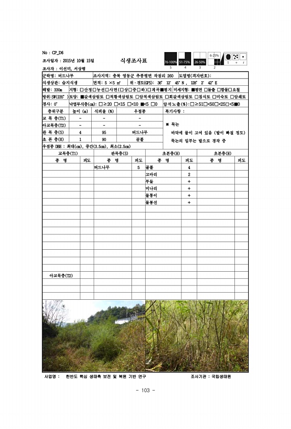 103 No CP_D6 조사일자 2015년 10월 15일 조사자 이선미, 서상령 식생조사표 군락명버드나무 조사지역충북 영동군 추풍령면 작점리 260 도엽명 격자번호 식생상관습지식생 면적5 ×5 ㎡ 위·경도 GPS 36° 12′ 45″N , 128° 2′ 42″E 해발330m 지형□산정□능선□사면 □상□중□하 □계곡■평지 미세지형■평면 □돌출 □함몰□요철 방위SW 235° 토양■갈색삼림토 □적황색삼림토 □암적색삼림토 □회갈색삼림토 □침식토 □미숙토 □암쇄토 경사0° 낙엽부식층 cm □≥20 □ 15 □ 10 ■ 5 □0 암석노 출 % □≥51□ 50□ 25□ 5■0 층위구분 높이 m 식피율 % 우점종 특기사항 교 목 층 T1 ※ 묵논 바닥에 물이 고여 있음 발이 빠질 정도 묵논의 일부는 밭으로 경작 중 아교목...
