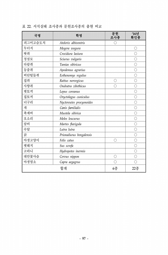 97 국명 학명 문헌 조사종 ‘16년 확인종 피그미고슴도치 Atelerix albiventris ? 두더지 Mogera wogura ? 땃쥐 Crocidura lasiura ? 청설모 Sciurus vulgaris ? 다람쥐 Tamias sibiricus ? 등줄쥐 Apodemus agrarius ? 비단털들쥐 Eothenomys regulus ? 집쥐 Rattus norvegicus ? ? 사향쥐 Ondratra zibethicus ? ? 멧토끼 Lepus coreanus ? 집토끼 Oryctolagus cuniculus ? 너구리 Nyctereutes procyonoides ? 개 Canis familialis ? 족제비 Mustela sibirica ? 오소리 Meles leucurus ? 담비 Mar...
