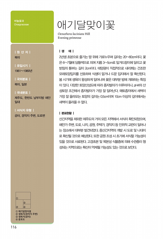 116 ① ② ③ ④ ① 애기달맞이꽃 ② 생육지 경작지 주변 ③ 생육지 공터 ④ 분포도 | 생 태 | 2년생 초본으로 줄기는 땅 위에 가로누우며 길이는 2060cm이다. 꽃 은 67월에 담황색으로 피며 지름 35cm로 잎겨드랑이에 달리고 꽃 받침의 통부는 길이 2cm이다. 태양광이 직접적으로 내리쬐는 건조한 모래토양입지를 선호하며 식생이 없거나 드문 입지에서 잘 확산된다. 봄 시기에 생육이 왕성하게 일어나며 꽃은 대부분 밤에 개화하는 특징 이 있다. 다양한 토양산성도에 따라 종자발아가 이루어지나, pH4의 산 성토양 조건에서 종자발아가 가장 잘 일어난다. 매토종자에서 새싹이 가장 잘 올라오는 토양의 깊이는 0.5cm이며 10cm 이상의 깊이에서는 새싹이 올라올 수 없다. | 분포현황 | 산간지역을 제외한 제...