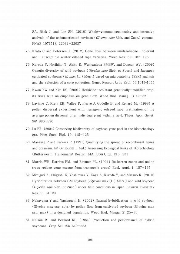 106 SA, Bhak J, and Lee SH. 2010 Whole-genome sequencing and intensive analysis of the undomesticated soybean Glycine soja Sieb. and Zucc. genome. PNAS 107 51 22032-22037 75. Krato C and Petersen J. 2012 Gene flow between imidazolinone- tolerant and -susceptible winter oilseed rape varieties. Weed Res. 52187-196 76. Kuroda Y, Norihiko T, Akito K, Wanigadeva SMSW, and Duncan AV. 2009 Genetic divers...