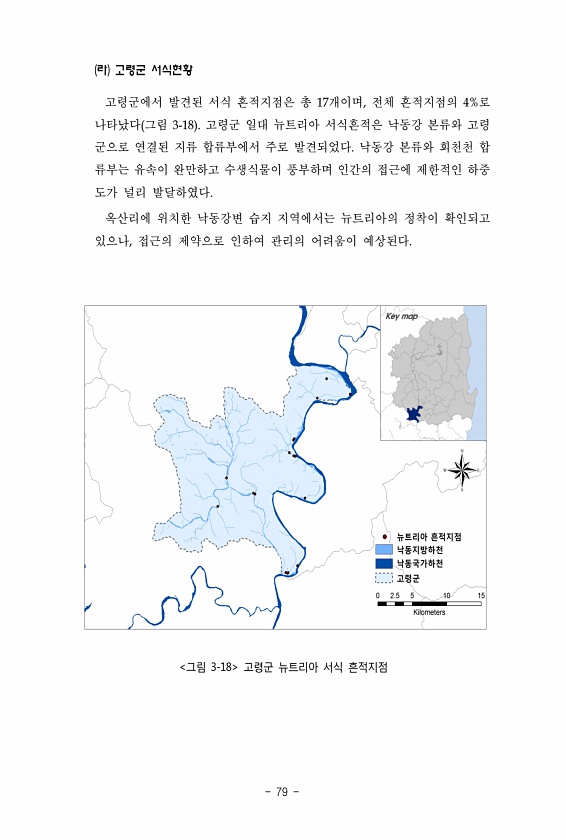 ? 고령군에서 발견된 서식 흔적지점은 총 17개이며, 전체 흔적지점의 4%로 나타났다 그림 3-18 고령군 일대 뉴트리아 서식흔적은 낙동강 본류와 고령 군으로 연결된 지류 합류부에서 주로 발견되었다. 낙동강 본류와 회천천 합 류부는 유속이 완만하고 수생식물이 풍부하며 인간의 접근에 제한적인 하중 도가 널리 발달하였다. 옥산리에 위치한 낙동강변 습지 지역에서는 뉴트리아의 정착이 확인되고 있으나, 접근의 제약으로 인하여 관리의 어려움이 예상된다. ? ? ??