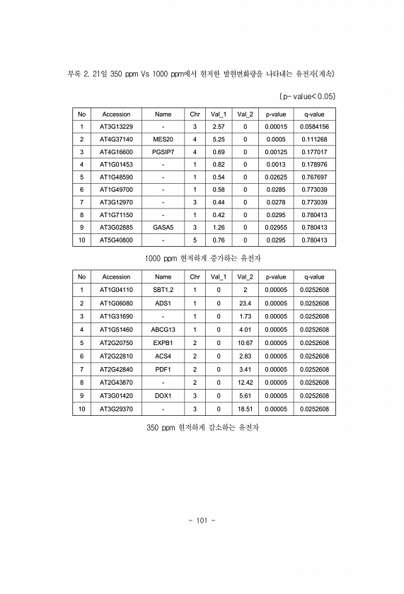 101 부록 2. 21일 350 ppm Vs 1000 ppm에서 현저한 발현변화량을 나타내는 유전자 계속 p- value 0.05 No Accession Name Chr Val_1 Val_2 p-value q-value 1 AT3G13229 3 2.57 0 0.00015 0.0584156 2 AT4G37140 MES20 4 5.25 0 0.0005 0.111268 3 AT4G16600 PGSIP7 4 0.69 0 0.00125 0.177017 4 AT1G01453 1 0.82 0 0.0013 0.178976 5 AT1G48590 1 0.54 0 0.02625 0.767697 6 AT1G49700 1 0.58 0 0.0285 0.773039 7 AT3G12970 3 0.44 0 0.0278 0.773039 8...
