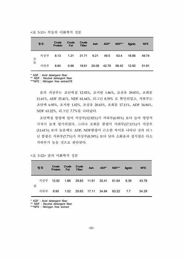 -90- 표 3-11 부들의 이화학적 성분 항목 Protein Crude Crude Fat Crude Fiber Ash ADF* NDF** lignin NFE 부들 지상부 8.13 1.21 31.71 9.21 49.5 63.4 18.86 49.74 지하부 8.84 0.66 18.61 20.08 42.79 58.42 12.92 51.81 * ADF Acid detergent fiber ** NDF Neutral detergent fiber ***NFE Nitrogen free extract78 줄의 지상부는 조단백질 12.92%, 조지방 1.86%, 조섬유 29.83%, 조회분 11.61%, ADF 35.41%, NDF 61.64%, 리그닌 8.39% 로 확인되었고, 지하부는 조단백 6.95%, 조지방 1.0...