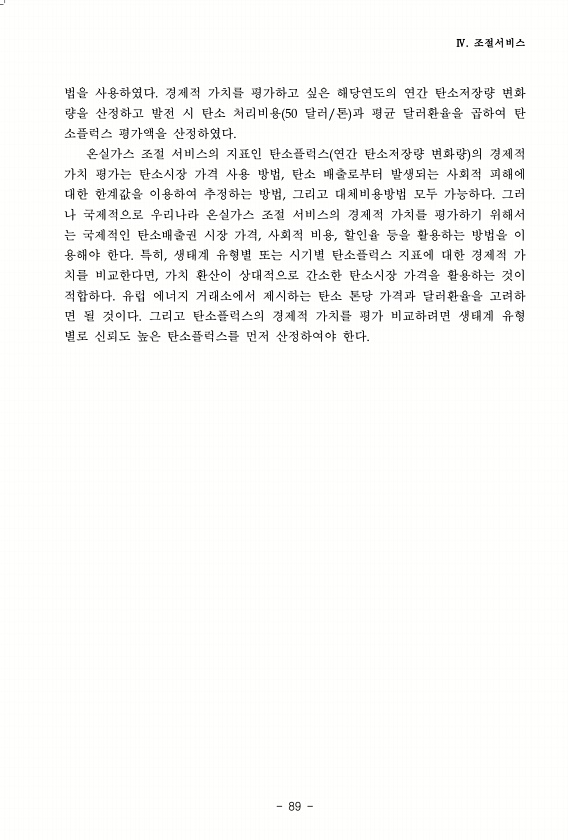 Ⅳ. 조절서비스 89 법을 사용하였다. 경제적 가치를 평가하고 싶은 해당연도의 연간 탄소저장량 변화 량을 산정하고 발전 시 탄소 처리비용 50 달러/톤 과 평균 달러환율을 곱하여 탄 소플럭스 평가액을 산정하였다. 온실가스 조절 서비스의 지표인 탄소플럭스 연간 탄소저장량 변화량 의 경제적 가치 평가는 탄소시장 가격 사용 방법, 탄소 배출로부터 발생되는 사회적 피해에 대한 한계값을 이용하여 추정하는 방법, 그리고 대체비용방법 모두 가능하다. 그러 나 국제적으로 우리나라 온실가스 조절 서비스의 경제적 가치를 평가하기 위해서 는 국제적인 탄소배출권 시장 가격, 사회적 비용, 할인율 등을 활용하는 방법을 이 용해야 한다. 특히, 생태계 유형별 또는 시기별 탄소플럭스 지표에 대한 경제적 가 치를 비교한다면, 가치 환산...