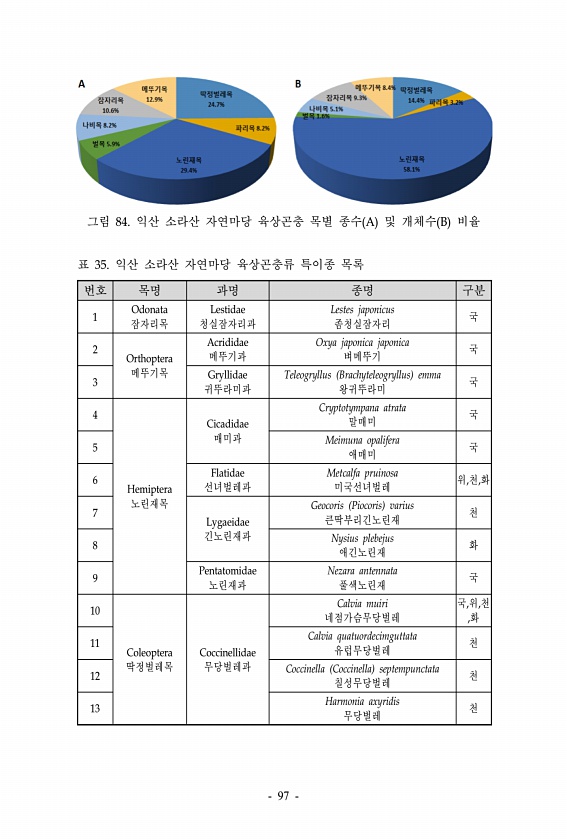 그림 84. 익산 소라산 자연마당 육상곤충 목별 종수 A 및 개체수 B 비율 번호 목명 과명 종명 구분 1 Odonata 잠자리목 Lestidae 청실잠자리과 Lestes japonicus 좀청실잠자리 국 2 Orthoptera 메뚜기목 Acrididae 메뚜기과 Oxya japonica japonica 벼메뚜기 국 3 Gryllidae 귀뚜라미과 Teleogryllus Brachyteleogryllus emma 왕귀뚜라미 국 4 Hemiptera 노린재목 Cicadidae 매미과 Cryptotympana atrata 말매미 국 5 Meimuna opalifera 애매미 국 6 Flatidae 선녀벌레과 Metcalfa pruinosa 미국선녀벌레 위,천,화 7 Lygaeidae 긴노린재과 Geocoris ...