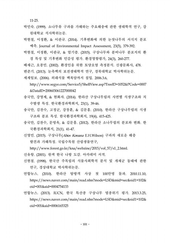 101 11-25. 박민숙. 1999 소나무류 구과를 가해하는 주요해충에 관한 생태학적 연구, 강 원대학교 석사학위논문. 박현철, 이정환, & 이관규. 2014 기후변화에 의한 눈잣나무의 서식지 분포 예측. Journal of Environmental Impact Assessment, 23 5 , 379-392. 박현철, 이정환, 이관규, & 엄기증. 2015 구상나무와 분비나무 분포지의 환 경 특성 및 기후변화 민감성 평가. 환경영향평가, 24 3 , 2N0-277. 배재근, 오종민. 2002 환경인을 위한 토양오염 측정분석. 신광문화사, 478. 변준기. 2013 눈측백의 보전생태학적 연구, 경북대학교 박사학위논문. 세계일보. 200N 외래식물 백록담까지 침입. 200N.3.N, http//www.seg...