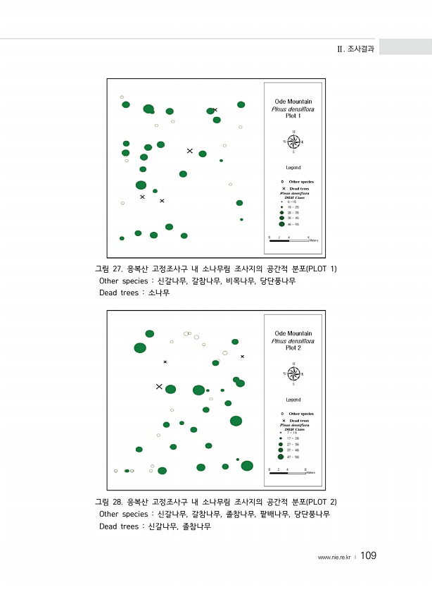 Ⅱ. 조사결과 www.nie.re.kr ? 109 그림 27. 응복산 고정조사구 내 소나무림 조사지의 공간적 분포 PLOT 1 Other species 신갈나무, 갈참나무, 비목나무, 당단풍나무 Dead trees 소나무 그림 28. 응복산 고정조사구 내 소나무림 조사지의 공간적 분포 PLOT 2 Other species 신갈나무, 갈참나무, 졸참나무, 팥배나무, 당단풍나무 Dead trees 신갈나무,졸참나무