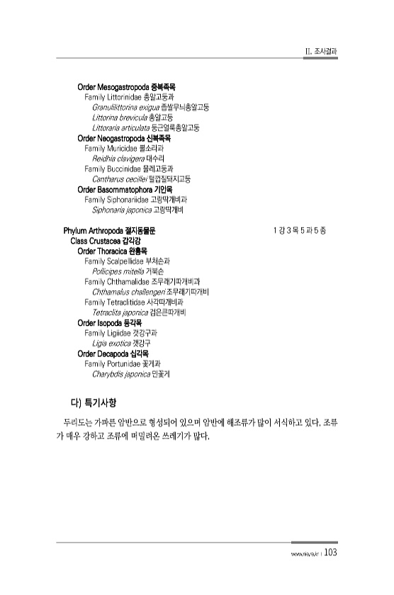 II. 조사결과 www.nie.re.kr ?103 Order Mesogastropoda 중복족목 Family Littorinidae 총알고둥과 Granulilittorina exigua 좁쌀무늬총알고둥 Littorina brevicula 총알고둥 Littoraria articulata 둥근얼룩총알고둥 Order Neogastropoda 신복족목 Family Muricidae 뿔소라과 Reidhia clavigera 대수리 Family Buccinidae 물레고둥과 Cantharus cecillei 털껍질돼지고둥 Order Basommatophora 기안목 Family Siphonariidae 고랑딱개비과 Siphonaria japonica 고랑딱개비 Phylum Arthropoda 절지동물문 1 강 3 목 ...