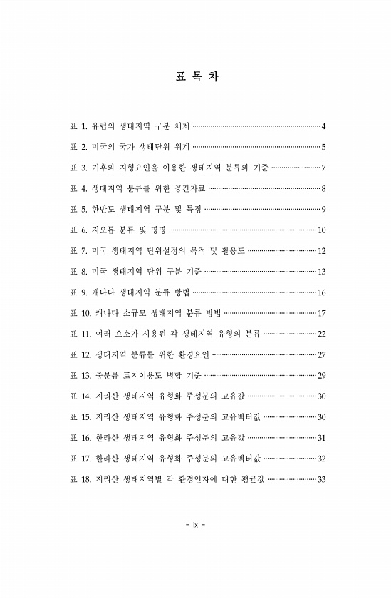 ix 표 목 차 표 1. 유럽의 생태지역 구분 체계 ································································4 표 2. 미국의 국가 생태단위 위계 ································································5 표 3. 기후와 지형요인을 이용한 생태지역 분류와 기준 ························ 7 표 4. 생태지역 분류를 위한 공간자료 ························································8 표 5. 한반도 생태지역 구분 및 특징 ··························································9...