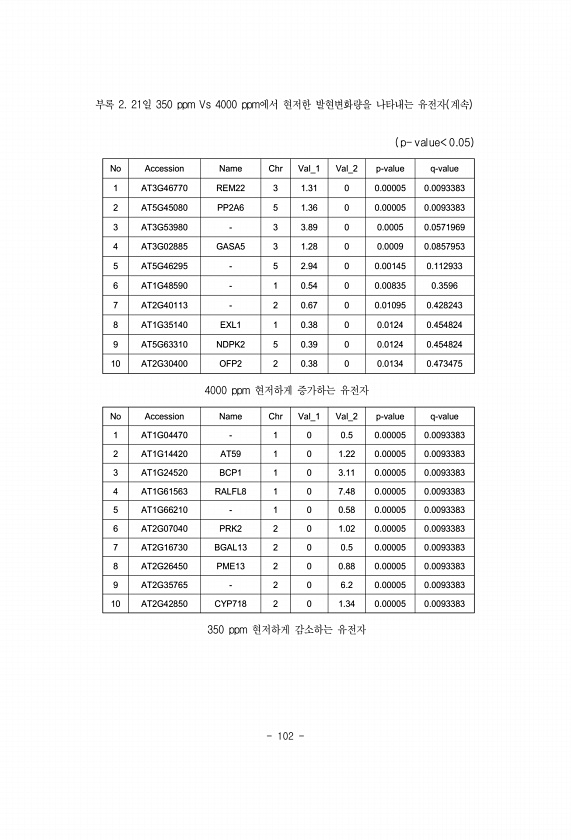 102 부록 2. 21일 350 ppm Vs 4000 ppm에서 현저한 발현변화량을 나타내는 유전자 계속 p- value 0.05 No Accession Name Chr Val_1 Val_2 p-value q-value 1 AT3G46770 REM22 3 1.31 0 0.00005 0.0093383 2 AT5G45080 PP2A6 5 1.36 0 0.00005 0.0093383 3 AT3G53980 3 3.89 0 0.0005 0.0571969 4 AT3G02885 GASA5 3 1.28 0 0.0009 0.0857953 5 AT5G46295 5 2.94 0 0.00145 0.112933 6 AT1G48590 1 0.54 0 0.00835 0.3596 7 AT2G40113 2 0.67 0 0.01095 0....
