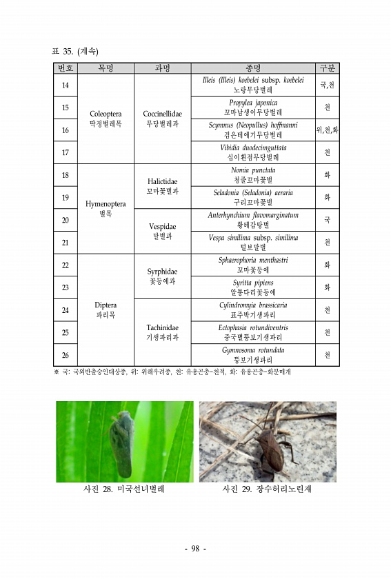 표 35. 계속 번호 목명 과명 종명 구분 14 Coleoptera 딱정벌레목 Coccinellidae 무당벌레과 Illeis Illeis koebelei subsp. koebelei 노랑무당벌레 국,천 15 Propylea japonica 꼬마남생이무당벌레 천 16 Scymnus Neopullus hoffmanni 검은테애기무당벌레 위,천,화 17 Vibidia duodecimguttata 십이흰점무당벌레 천 18 Hymenoptera 벌목 Halictidae 꼬마꽃벌과 Nomia punctata 청줄꼬마꽃벌 화 19 Seladonia Seladonia aeraria 구리꼬마꽃벌 화 20 Vespidae 말벌과 Anterhynchium flavomarginatum 황테감탕벌 국 21 Vespa simili...