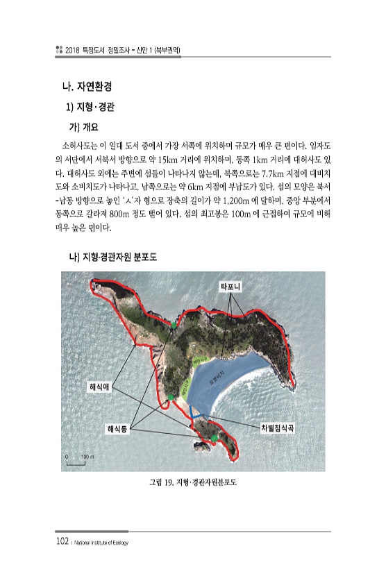 2018 특정도서 정밀조사 신안 1 북부권역 102 ? National Institute of Ecology 1 · 소허사도는 이 일대 도서 중에서 가장 서쪽에 위치하며 규모가 매우 큰 편이다. 임자도 의 서단에서 서북서 방향으로 약 15km 거리에 위치하며, 동쪽 1km 거리에 대허사도 있 다. 대허사도 외에는 주변에 섬들이 나타나지 않는데, 북쪽으로는 7.7km 지점에 대비치 도와 소비치도가 나타나고, 남쪽으로는 약 6km 지점에 부남도가 있다. 섬의 모양은 북서 -남동 방향으로 놓인 ‘ㅅ’자 형으로 장축의 길이가 약 1,200m 에 달하며, 중앙 부분에서 동쪽으로 갈라져 800m 정도 뻗어 있다. 섬의 최고봉은 100m 에 근접하여 규모에 비해 매우 높은 편이다. ? 그림 19.지형·경관자원분포도