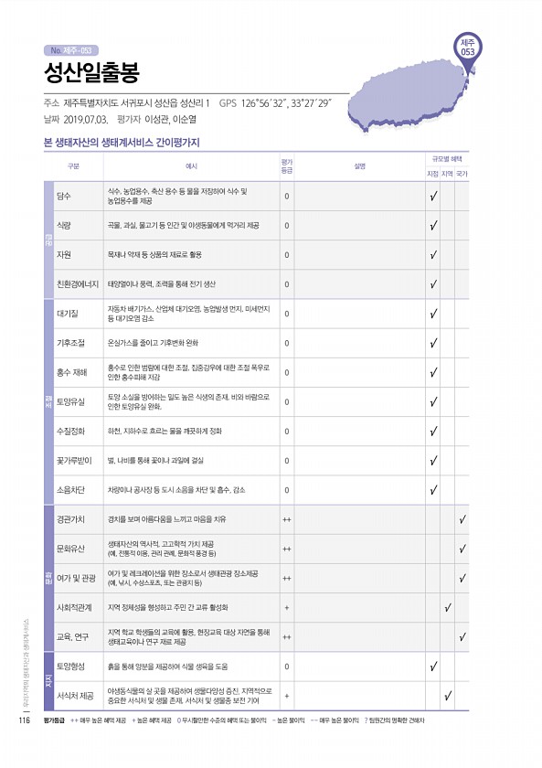No. 제주- 제주 053 본 생태자산의 생태계서비스 간이평가지 구분 예시 평가 등급 설명 규모별 혜택 지점 지역 국가 공급 담수 식수, 농업용수, 축산 용수 등 물을 저장하여 식수 및 농업용수를 제공 0 √ 식량 곡물, 과실, 물고기 등 인간 및 야생동물에게 먹거리 제공 0 √ 자원 목재나 약재 등 상품의 재료로 활용 0 √ 친환경에너지 태양열이나 풍력, 조력을 통해 전기 생산 0 √ 조절 대기질 자동차 배기가스, 산업체 대기오염, 농업발생 먼지, 미세먼지 등 대기오염 감소 0 √ 기후조절 온실가스를 줄이고 기후변화 완화 0 √ 홍수 재해 홍수로 인한 범람에 대한 조절, 집중강우에 대한 조절 폭우로 인한 홍수피해 저감 0 √ 토양유실 토양 소실을 방어하는 밀도 높은 식생의 존재, 비와 바람으로 인한 토양유...