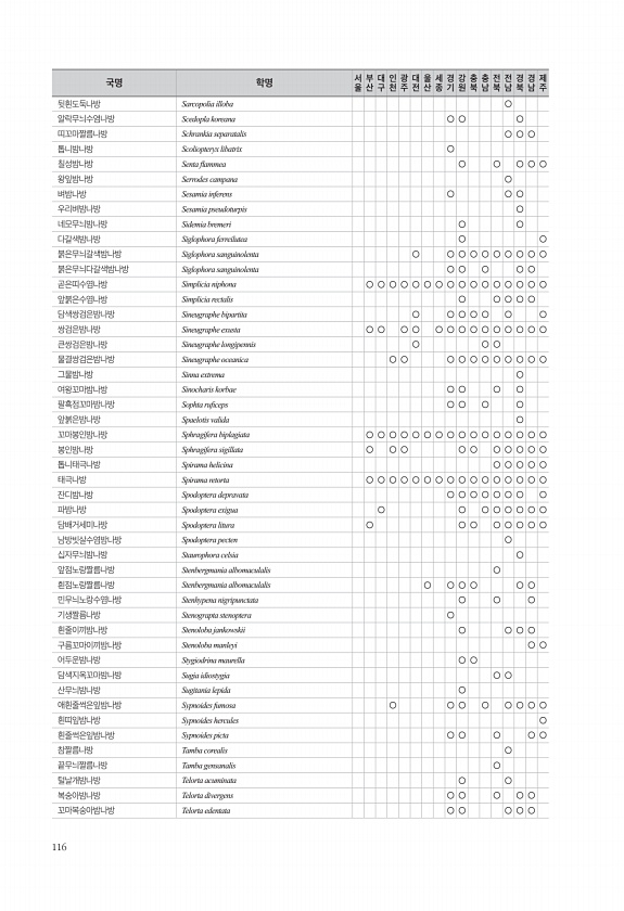 116 뒷흰도둑나방 Sarcopolia illoba ○ 알락무늬수염나방 Scedopla koreana ○ ○ ○ 띠꼬마짤름나방 Schrankia separatalis ○ ○ ○ 톱니밤나방 Scoliopteryx libatrix ○ 칠성밤나방 Senta fammea ○ ○ ○ ○ ○ 왕잎밤나방 Serrodes campana ○ 벼밤나방 Sesamia inferens ○ ○ ○ 우리벼밤나방 Sesamia pseudoturpis ○ 네모무늬밤나방 Sidemia bremeri ○ ○ 다갈색밤나방 Siglophora ferreilutea ○ ○ 붉은무늬갈색밤나방 Siglophora sanguinolenta ○ ○ ○ ○ ○ ○ ○ ○ ○ ○ 붉은무늬다갈색밤나방 Siglophora sanguinolenta ○ ○ ○ ...