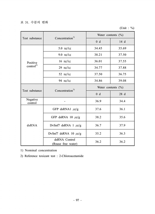97 표 31. 수분의 변화 Unit % Test substance Concentration1 Water contents % 0 d 14 d Positive control2 5.0 ㎎/㎏ 34.45 35.69 9.0 ㎎/㎏ 38.21 37.50 16 ㎎/㎏ 36.01 37.55 29 ㎎/㎏ 34.77 37.88 52 ㎎/㎏ 37.50 36.75 94 ㎎/㎏ 34.86 39.08 Test substance Concentration1 Water contents % 0 d 28 d Negative control 36.9 34.4 dsRNA GFP dsRNA1 ㎍/g 37.6 36.1 GFP dsRNA 10 ㎍/g 38.2 35.6 DvSnf7 dsRNA 1 ㎍/g 36.7 37.9 DvSnf7 dsRNA 10 ㎍...