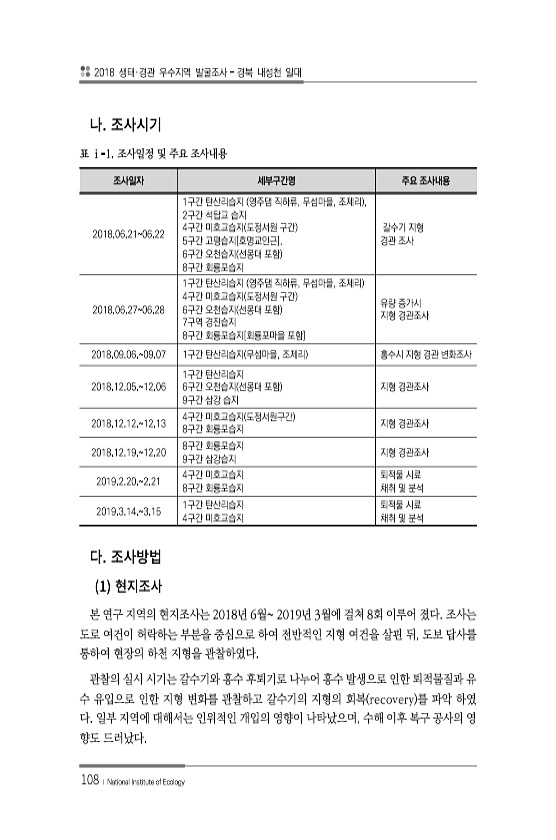 2018 생태·경관 우수지역 발굴조사 경북 내성천 일대 108 ? National Institute of Ecology 조사일자 세부구간명 주요 조사내용 2018.06.2106.22 1구간 탄산리습지 영주댐 직하류, 무섬마을, 조제리 , 2구간 석탑교 습지 4구간 미호교습지 도정서원 구간 5구간 고평습지[호명교인근], 6구간 오천습지 선몽대 포함 8구간 회룡포습지 갈수기 지형 경관 조사 2018.06.2706.28 1구간 탄산리습지 영주댐 직하류, 무섬마을, 조제리 4구간 미호교습지 도정서원 구간 6구간 오천습지 선몽대 포함 7구역 경진습지 8구간 회룡포습지[회룡포마을 포함] 유량 증가시 지형 경관조사 2018.09.06.09.07 1구간 탄산리습지 무섬마을, 조제리 홍수시 지형 경관 변화조사 2018.12...