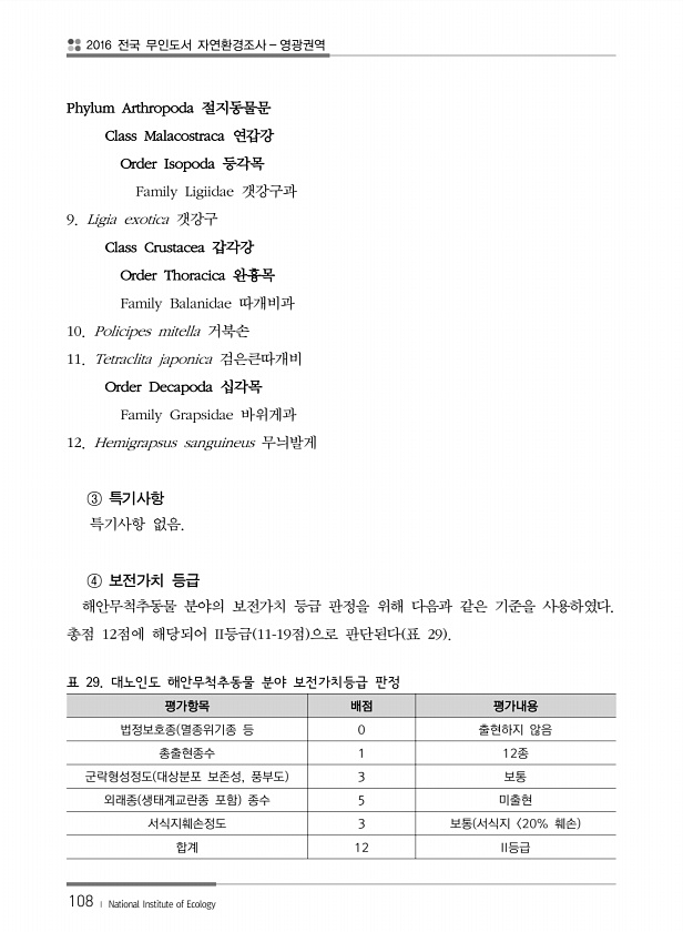 2016 전국 무인도서 자연환경조사 영광권역 108 ? National Institute of Ecology Phylum Arthropoda 절지동물문 Class Malacostraca 연갑강 Order Isopoda 등각목 Family Ligiidae 갯강구과 9. Ligia exotica 갯강구 Class Crustacea 갑각강 Order Thoracica 완흉목 Family Balanidae 따개비과 10. Policipes mitella 거북손 11. Tetraclita japonica 검은큰따개비 Order Decapoda 십각목 Family Grapsidae 바위게과 12. Hemigrapsus sanguineus 무늬발게 ③ 특기사항 특기사항 없음. ④ 보전가치 등급 해안무척추동물 분야의 보전...
