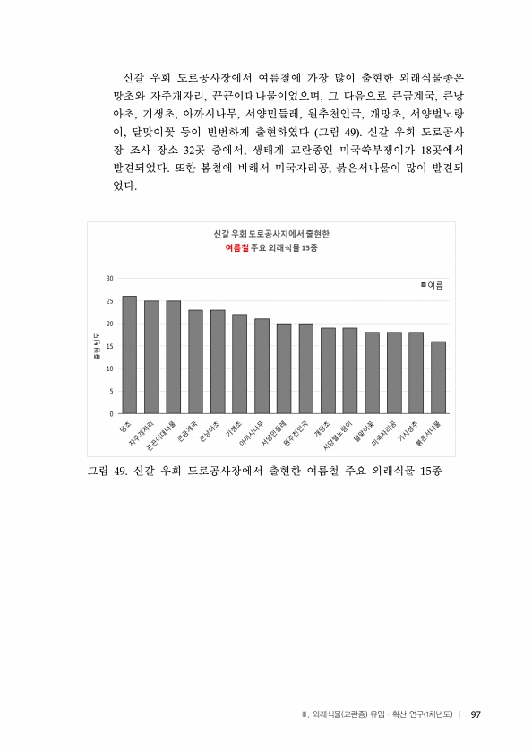신갈 우회 도로공사장에서 여름철에 가장 많이 출현한 외래식물종은 망초와 자주개자리, 끈끈이대나물이었으며, 그 다음으로 큰금계국, 큰낭 아초, 기생초, 아까시나무, 서양민들레, 원추천인국, 개망초, 서양벌노랑 이, 달맞이꽃 등이 빈번하게 출현하였다 그림 49 신갈 우회 도로공사 장 조사 장소 32곳 중에서, 생태계 교란종인 미국쑥부쟁이가 18곳에서 발견되었다. 또한 봄철에 비해서 미국자리공, 붉은서나물이 많이 발견되 었다. 그림 신갈 우회 도로공사장에서 출현한 여름철 주요 외래식물 종 Ⅲ. 외래식물 교란종 유입·확산 연구 1차년도 |97