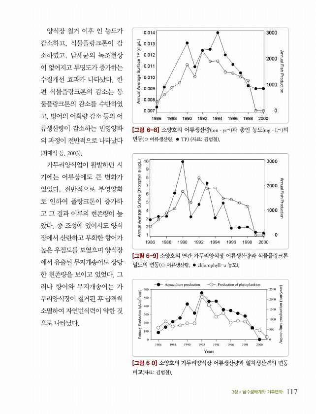 3장 담수생태계와 기후변화 117 양식장 철거 이후 인 농도가 감소하고, 식물플랑크톤이 감 소하였고, 남세균의 녹조현상 이 없어지고 투명도가 증가하는 수질개선 효과가 나타났다. 한 편 식물플랑크톤의 감소는 동 물플랑크톤의 감소를 수반하였 고, 빙어의 어획량 감소 등의 어 류생산량이 감소하는 빈영양화 의 과정이 전반적으로 나타났다 최재석 등, 2003 가두리양식업이 활발하던 시 기에는 어류상에도 큰 변화가 있었다. 전반적으로 부영양화 로 인하여 플랑크톤이 증가하 고 그 결과 어류의 현존량이 높 았다. 종 조성에 있어서도 양식 장에서 산란하고 부화한 향어가 높은 우점도를 보였으며 양식장 에서 유출된 무지개송어도 상당 한 현존량을 보이고 있었다. 그 러나 향어와 무지개송어는 가 두리양식장이 철거된 후 급격히 소멸...