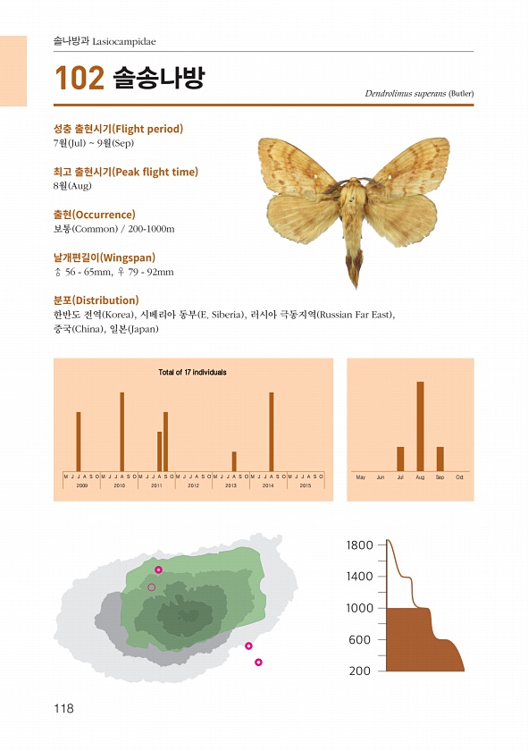 118 솔나방과 Lasiocampidae 성충 출현시기 Flight period 7월 Jul 9월 Sep 최고 출현시기 Peak fight time 8월 Aug 출현 Occurrence 보통 Common 200-1000m 날개편길이 Wingspan ♂ 56 65mm, ♀ 79 92mm 분포 Distribution 한반도 전역 Korea , 시베리아 동부 E. Siberia , 러시아 극동지역 Russian Far East , 중국 China , 일본 Japan Dendrolimus superans Butler M J J A S O M J J A S O M J J A S O M J J A S O M J J A S O M J J A S O M J J A S O May Jun Jul Aug Sep Oct 2009...