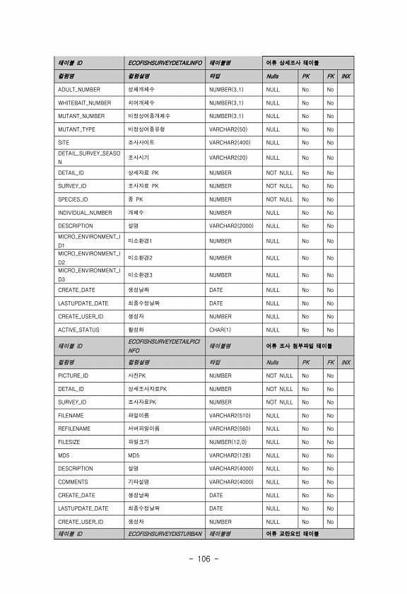 106 테이블 ID ECOFISHSURVEYDETAILINFO 테이블명 어류 상세조사 테이블 컬럼명 컬럼설명 타입 Nulls PK FK INX ADULT_NUMBER 성체개체수 NUMBER 3,1 NULL No No WHITEBAIT_NUMBER 치어개체수 NUMBER 3,1 NULL No No MUTANT_NUMBER 비정상어종개체수 NUMBER 3,1 NULL No No MUTANT_TYPE 비정상어종유형 VARCHAR2 50 NULL No No SITE 조사사이트 VARCHAR2 400 NULL No No DETAIL_SURVEY_SEASO N 조사시기 VARCHAR2 20 NULL No No DETAIL_ID 상세자료 PK NUMBER NOT NULL No No SURVEY_ID 조사자료 PK NUM...