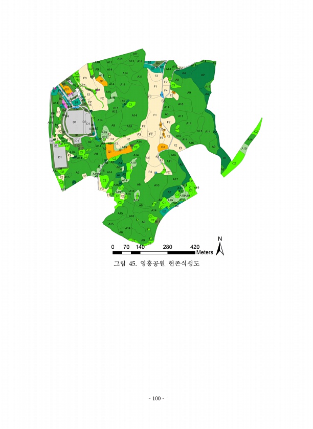 전국 해안사구 정밀조사 송정사구 108 ? National Institute of Ecology 기점으로부터 서쪽 내륙 방향 으로 16.0 m 지점까지 곰솔군락이 형성되어 있다 식생조사표 남측선-3 이 곰솔군락은 높이가 해양 측은 8 m, 도로 측은 12 m로 평균 높이가 10 m, 전체 피도는 100%이다. 이곳에서 곰솔의 밀도와 평균흉고둘레는 각각 44개체 1,375/㏊ , 53.45±15.16 ㎝이었다. 관목층은 거의 없고 초본층은 피도가 60%이고 우점종은 잔디다. 그리고 구성종은 25종으로 대단히 많지만 이중 외래종이 7종을 차지하고 있다. 그리고 나머지 종들도 교란지에 흔히 출현하는 것으로서 교란이 심하게 가해진 식생으로 볼 수 있다. 도로의 양측에는 맥문동이나 사철나무가 식재되어 있다. 남부 측...