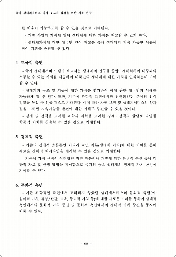 국가 생태계서비스 평가 보고서 발간을 위한 기초 연구 98 한 이용이 가능하도록 할 수 있을 것으로 기대된다. 개발 사업의 계획에 있어 생태계에 대한 가치를 재고할 수 있게 한다. 생태계가치에 대한 대국민 인식 재고를 통해 생태계의 지속 가능한 이용에 참여 기회를 증진할 수 있다. 4. 교육적 측면 국가 생태계서비스 평가 보고서는 생태계의 연구를 종합?재해석하여 대중과의 소통할 수 있는 기회를 제공하여 대국민의 생태계에 대한 가치를 인식하는데 기여 할 수 있다. 생태계의 구조 및 기능에 대한 가치를 평가하여 이에 관한 대국민의 이해를 가능하게 할 수 있다. 또한, 기존에 과학적 측면에서만 진행되었던 분야의 인식 정도를 높일 수 있을 것으로 기대된다. 이에 따라 자연 보전 및 생태계서비스의 양과 질을 고려한 ...