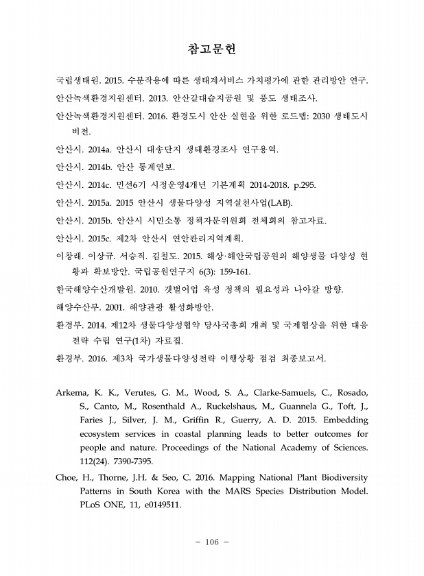 106 참고문헌 국립생태원. 2015. 수분작용에 따른 생태계서비스 가치평가에 관한 관리방안 연구. 안산녹색환경지원센터. 2013. 안산갈대습지공원 및 풍도 생태조사. 안산녹색환경지원센터. 2016. 환경도시 안산 실현을 위한 로드맵2030 생태도시 비전. 안산시. 2014a. 안산시 대송단지 생태환경조사 연구용역. 안산시. 2014b. 안산 통계연보. 안산시. 2014c. 민선6기 시정운영4개년 기본계획 2014-2018. p.295. 안산시. 2015a. 2015 안산시 생물다양성 지역실천사업 LAB 안산시. 2015b. 안산시 시민소통 정책자문위원회 전체회의 참고자료. 안산시. 2015c. 제2차 안산시 연안관리지역계획. 이창래. 이상규. 서승직. 김철도. 2015. 해상·해안국립공원의 해양생물 다양성...