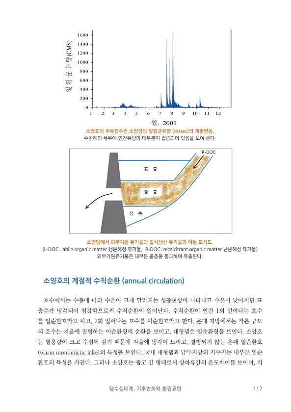 담수생태계, 기후변화와 환경교란 117 소양호의 주유입수인 소양강의 일평균유량 ㎥/sec 의 계절변동. 수차례의 폭우에 연간유량의 대부분이 집중되어 있음을 보여 준다. 소양댐에서 외부기원 유기물과 일차생산 유기물의 이동 모식도. L-DOC; labile organic matter 생분해성 유기물, R-DOC; recalcitrant organic matter 난분해성 유기물 외부기원유기물은 대부분 중층을 통과하여 유출된다. 소양호의 계절적 수직순환 annual circulation 호수에서는 수층에 따라 수온이 크게 달라지는 성층현상이 나타나고 수온이 낮아지면 표 층수가 냉각되어 침강함으로써 수직순환이 일어난다. 수직순환이 연간 1회 일어나는 호수 를 일순환호라고 하고, 2회 일어나는 호수를 이순환호라고 한...