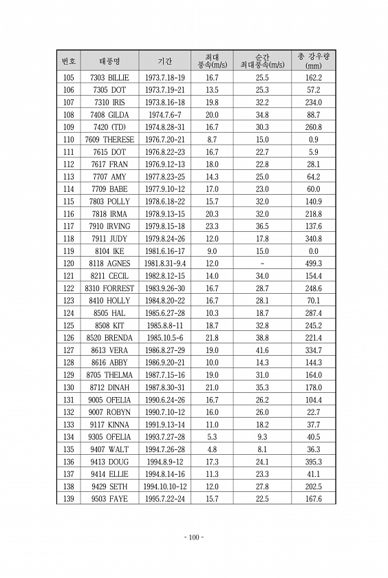 번호 태풍명 기간 풍속최대 m/s 최대풍속 순간 m/s 총 mm 강우량 105 7303 BILLIE 1973.7.18-19 16.7 25.5 162.2 106 7305 DOT 1973.7.19-21 13.5 25.3 57.2 107 7310 IRIS 1973.8.16-18 19.8 32.2 234.0 108 7408 GILDA 1974.7.6-7 20.0 34.8 88.7 109 7420 TD 1974.8.28-31 16.7 30.3 260.8 110 7609 THERESE 1976.7.20-21 8.7 15.0 0.9 111 7615 DOT 1976.8.22-23 16.7 22.7 5.9 112 7617 FRAN 1976.9.12-13 18.0 22.8 28.1 113 7707 AMY 1977.8.23-2...