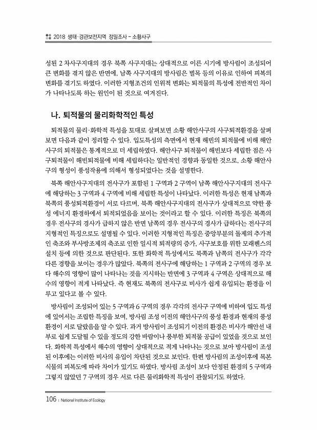 2018 생태·경관보전지역 정밀조사 소황사구 106 ? National Institute of Ecology 성된 2 차사구지대의 경우 북쪽 사구지대는 상대적으로 이른 시기에 방사림이 조성되어 큰 변화를 겪지 않은 반면에, 남쪽 사구지대의 방사림은 벌목 등의 이유로 인하여 피복의 변화를 겪기도 하였다. 이러한 지형조건의 인위적 변화는 퇴적물의 특성에 전반적인 차이 가 나타나도록 하는 원인이 된 것으로 여겨진다. 퇴적물의 물리·화학적 특성을 토대로 살펴보면 소황 해안사구의 사구퇴적환경을 살펴 보면 다음과 같이 정리할 수 있다. 입도특성의 측면에서 현재 해빈의 퇴적물에 비해 해안 사구의 퇴적물은 통계적으로 더 세립하였다. 해안사구 퇴적물이 해빈보다 세립한 점은 사 구퇴적물이 해빈퇴적물에 비해 세립하다는 일반적인...