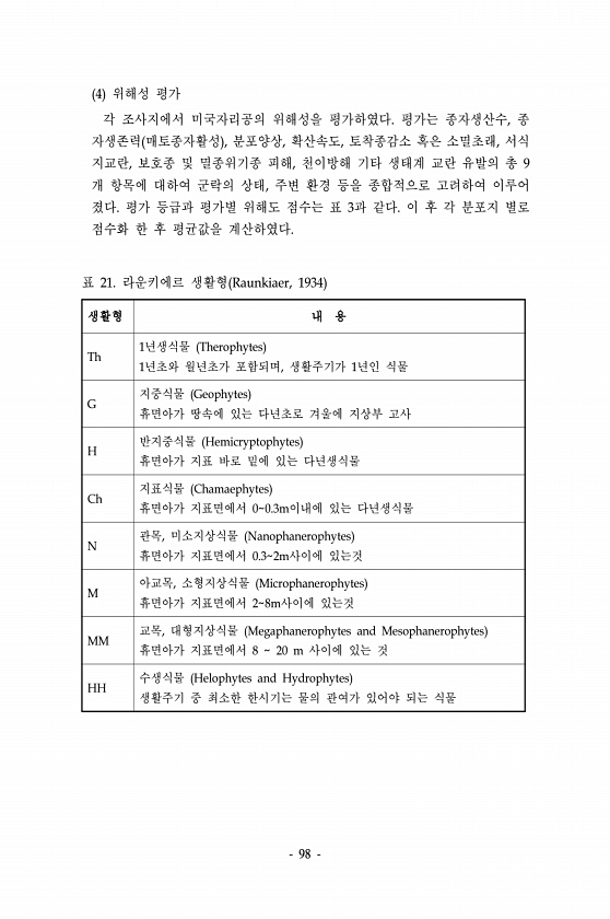 98 4 위해성 평가 각 조사지에서 미국자리공의 위해성을 평가하였다. 평가는 종자생산수, 종 자생존력 매토종자활성 , 분포양상, 확산속도, 토착종감소 혹은 소멸초래, 서식 지교란, 보호종 및 멸종위기종 피해, 천이방해 기타 생태계 교란 유발의 총 9 개 항목에 대하여 군락의 상태, 주변 환경 등을 종합적으로 고려하여 이루어 졌다. 평가 등급과 평가별 위해도 점수는 표 3과 같다. 이 후 각 분포지 별로 점수화 한 후 평균값을 계산하였다. 생활형 내 용 Th 1년생식물 Therophytes 1년초와 월년초가 포함되며, 생활주기가 1년인 식물 G 지중식물 Geophytes 휴면아가 땅속에 있는 다년초로 겨울에 지상부 고사 H 반지중식물 Hemicryptophytes 휴면아가 지표 바로 밑에 있는 다년생식물 Ch...