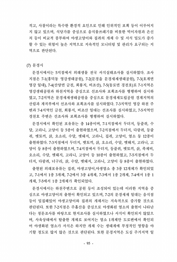 적고, 사찰이라는 특수한 환경적 요인으로 인해 인위적인 포획 등이 이루어지 지 않고 있으며, 식당가를 중심으로 음식물쓰레기를 비롯한 먹이자원과 은신 처 등이 비교적 풍부하여 야생고양이와 집쥐의 개체 수 및 서식 밀도가 증가 할 수 있는 위험이 높은 지역으로 지속적인 모니터링 및 관리가 요구되는 지 역으로 판단된다. 7 문경시 문경시에서는 5지점에서 외래생물 전국 서식실태조사를 실시하였다. 조사 지점은 7-1 흥덕동 영강생태공원 , 7-2 문경읍 문경새재생태공원 , 7-3 호계면 영강 일대 , 7-4 산양면 금천, 회룡지, 비조산 , 7-5 동로면 경천호 로 7-1지역은 영강생태공원과 하천지역을 중심으로 선조사와 포획조사를 병행하여 실시하 였고, 7-2지역은 문경새재생태공원을 중심으로 문경새재도립공원 경계지역...