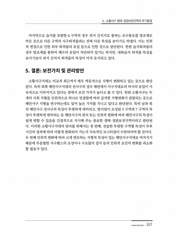 ii. 소황사구 생태·경관보전지역의 무기환경 www.nie.re.kr ?107 마지막으로 습지를 포함한 6 구역의 경우 과거 간석지로 통하는 조수통로를 방조제로 막은 곳으로 다른 구역의 사구퇴적물과는 전혀 다른 특성을 보이기도 하였다. 이는 인위 적 변경으로 인한 외부 퇴적물의 유입 등으로 인한 것으로 판단된다. 한편 습지퇴적물의 경우 방조제를 통하여 해수의 유입이 차단되어 있기는 하지만, 내륙습지 퇴적물 특성을 보이기보다 과거 간석지 퇴적물의 특성이 아직 유지되고 있다. 5. 소황사구지대는 비교적 최근까지 매우 역동적으로 지형이 변화하고 있는 곳으로 판단 된다. 특히 북쪽 해안사구지대의 전사구의 경우 해빈에서 사구지대로의 비사의 유입이 지 속적으로 이루어지고 있다는 점에서 보전 가치가 높다고 볼 수 있다....