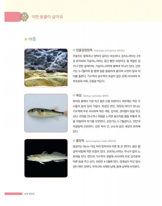 남해 앵강만 어류 복섬 Takifugu niphobles 참복과 복어류 중에서 가장 작고 몸은 곤봉 모양이다. 피부에는 작은 가 시들이 돋아 있어 거칠다. 복섬은 연안, 하천과 바다가 만나는 기수역에 주로 서식하며 작은 게류, 갑각류, 갯지렁이 등을 먹고 산다. 천적을 만나거나 위험을 느끼면 풍선처럼 몸을 부풀려 적 을 위협하여 위기를 모면한다. 산란기는 57월경이고, 연안의 자갈밭에 산란한다. 강한 독이 간, 난소와 같은 내장과 표피에 있다. 민물검정망둑 Tridentiger brevispinis 망둑어과 주둥이는 뭉툭하고 양턱의 길이는 비슷하다. 등지느러미는 2개 로 분리되며 가슴지느러미는 둥근 빨판 모양이다. 몸 색깔은 검 거나 연한 갈색이며, 가슴지느러미에 황백색 무늬가 있다. 산란 기는 57월이며 ...