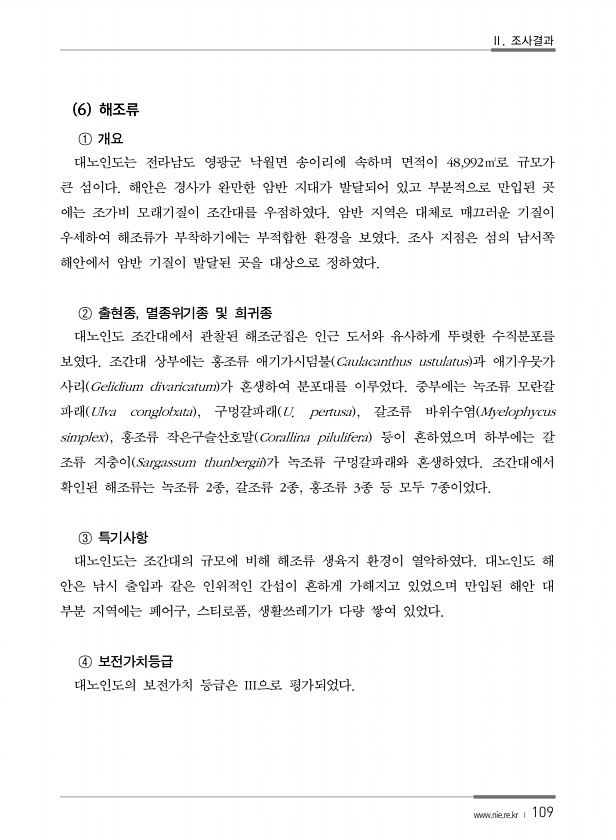 Ⅱ. 조사결과 www.nie.re.kr ? 109 6 해조류 ① 개요 대노인도는 전라남도 영광군 낙월면 송이리에 속하며 면적이 48,992㎡로 규모가 큰 섬이다. 해안은 경사가 완만한 암반 지대가 발달되어 있고 부분적으로 만입된 곳 에는 조가비 모래기질이 조간대를 우점하였다. 암반 지역은 대체로 매끄러운 기질이 우세하여 해조류가 부착하기에는 부적합한 환경을 보였다. 조사 지점은 섬의 남서쪽 해안에서 암반 기질이 발달된 곳을 대상으로 정하였다. ② 출현종, 멸종위기종 및 희귀종 대노인도 조간대에서 관찰된 해조군집은 인근 도서와 유사하게 뚜렷한 수직분포를 보였다. 조간대 상부에는 홍조류 애기가시덤불 Caulacanthus ustulatus 과 애기우뭇가 사리 Gelidium divaricatum 가 혼생하여 분...