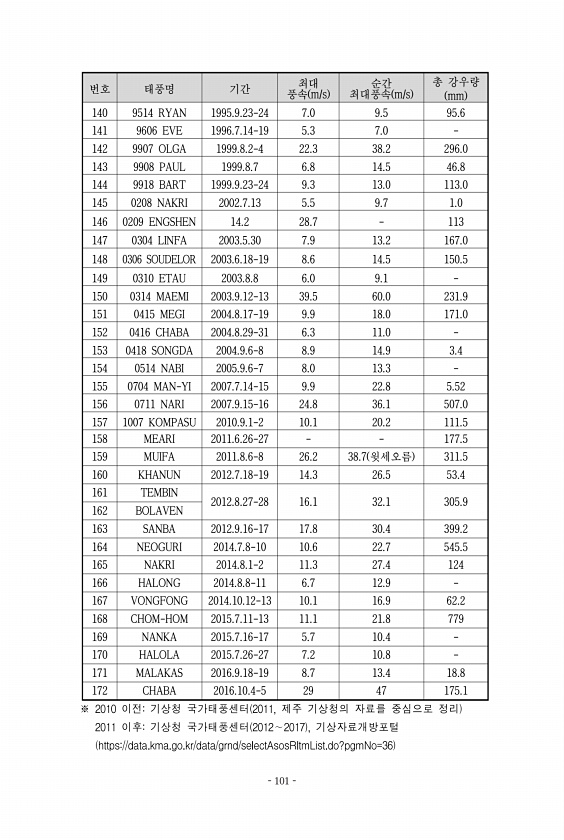 번호 태풍명 기간 풍속최대 m/s 최대풍속 순간 m/s 총 mm 강우량 140 9514 RYAN 1995.9.23-24 7.0 9.5 95.6 141 9606 EVE 1996.7.14-19 5.3 7.0 142 9907 OLGA 1999.8.2-4 22.3 38.2 296.0 143 9908 PAUL 1999.8.7 6.8 14.5 46.8 144 9918 BART 1999.9.23-24 9.3 13.0 113.0 145 0208 NAKRI 2002.7.13 5.5 9.7 1.0 146 0209 ENGSHEN 14.2 28.7 113 147 0304 LINFA 2003.5.30 7.9 13.2 167.0 148 0306 SOUDELOR 2003.6.18-19 8.6 14.5 150.5 149 0310 ETA...