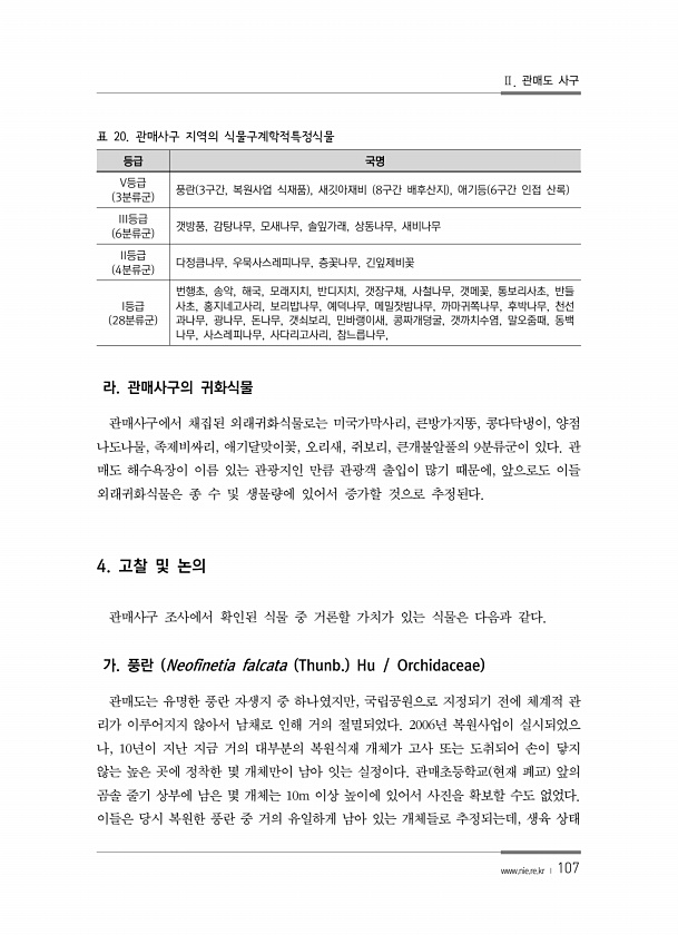 Ⅱ. 관매도 사구 www.nie.re.kr ? 107 표 20. 관매사구 지역의 식물구계학적특정식물 등급 국명 V등급 3분류군 풍란 3구간, 복원사업 식재품 , 새깃아재비 8구간 배후산지 , 애기등 6구간 인접 산록 III등급 6분류군 갯방풍, 감탕나무, 모새나무, 솔잎가래, 상동나무, 새비나무 II등급 4분류군 다정큼나무, 우묵사스레피나무, 층꽃나무, 긴잎제비꽃 I등급 28분류군 번행초, 송악, 해국, 모래지치, 반디지치, 갯장구채, 사철나무, 갯메꽃, 통보리사초, 반들 사초, 홍지네고사리, 보리밥나무, 예덕나무, 메밀잣밤나무, 까마귀쪽나무, 후박나무, 천선 과나무, 광나무, 돈나무, 갯쇠보리, 민바랭이새, 콩짜개덩굴, 갯까치수염, 말오줌때, 동백 나무, 사스레피나무, 사다리고사리, 참느릅나무, 라. 관매...