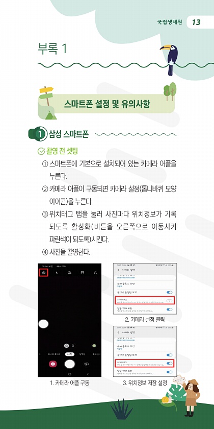 13 1 삼성 스마트폰 촬영 전 셋팅 ① 스마트폰에 기본으로 설치되어 있는 카메라 어플을 누른다. ② 카메라 어플이 구동되면 카메라 설정 톱니바퀴 모양 아이콘 을 누른다. ③ 위치태그 탭을 눌러 사진마다 위치정보가 기록 되도록 활성화 버튼을 오른쪽으로 이동시켜 파란색이 되도록 시킨다. ④ 사진을 촬영한다. 스마트폰 설정 및 유의사항 부록 1 1. 카메라 어플 구동 3. 위치정보 저장 설정 2. 카메라 설정클릭