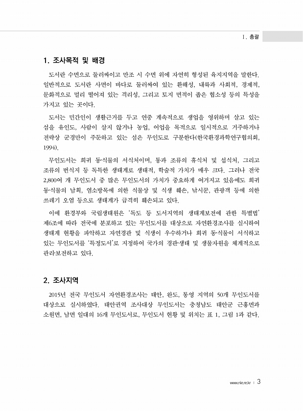 Ⅰ. 총괄 www.nie.re.kr ? 3 1. 조사목적 및 배경 도서란 수면으로 둘러싸이고 만조 시 수면 위에 자연히 형성된 육지지역을 말한다. 일반적으로 도서란 사면이 바다로 둘러싸여 있는 환해성, 내륙과 사회적, 경제적, 문화적으로 멀리 떨어져 있는 격리성, 그리고 토지 면적이 좁은 협소성 등의 특성을 가지고 있는 곳이다. 도서는 민간인이 생활근거를 두고 연중 계속적으로 생업을 영위하며 살고 있는 섬을 유인도, 사람이 살지 않거나 농업, 어업을 목적으로 일시적으로 거주하거나 전략상 군경만이 주둔하고 있는 섬은 무인도로 구분한다 한국환경과학연구협의회, 1994 무인도서는 희귀 동?식물의 서식처이며, 통과 조류의 휴식처 및 섭식처, 그리고 조류의 번식지 등 독특한 생태계로 생태적, 학술적 가치가 매우 크다...