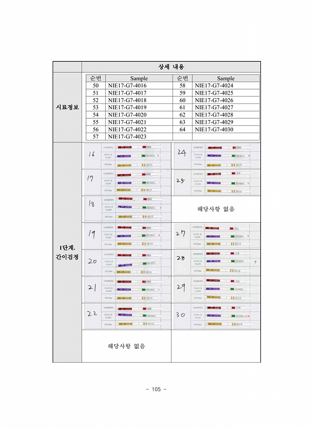 105 상세 내용 시료정보 순번 Sample 순번 Sample 50 NIE17-G7-4016 58 NIE17-G7-4024 51 NIE17-G7-4017 59 NIE17-G7-4025 52 NIE17-G7-4018 60 NIE17-G7-4026 53 NIE17-G7-4019 61 NIE17-G7-4027 54 NIE17-G7-4020 62 NIE17-G7-4028 55 NIE17-G7-4021 63 NIE17-G7-4029 56 NIE17-G7-4022 64 NIE17-G7-4030 57 NIE17-G7-4023 1단계. 간이검정 해당사항 없음 해당사항없음