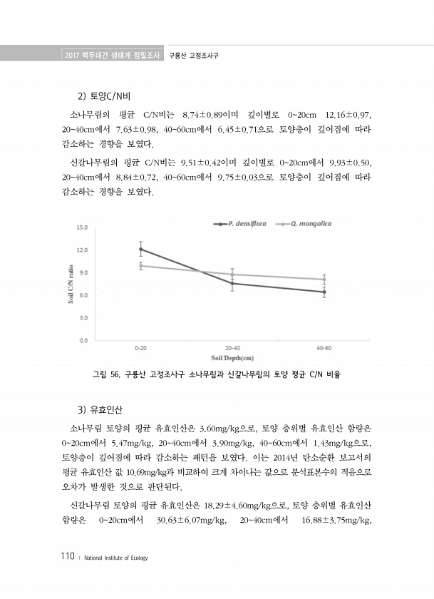 2017 백두대간 생태계 정밀조사 구룡산 고정조사구 110 ? National Institute of Ecology 2 토양C/N비 소나무림의 평균 C/N비는 8.74±0.89이며 깊이별로 020cm 12.16±0.97, 2040cm에서 7.63±0.98, 4060cm에서 6.45±0.71으로 토양층이 깊어짐에 따라 감소하는 경향을 보였다. 신갈나무림의 평균 C/N비는 9.51±0.42이며 깊이별로 020cm에서 9.93±0.50, 2040cm에서 8.84±0.72, 4060cm에서 9.75±0.03으로 토양층이 깊어짐에 따라 감소하는 경향을 보였다. 그림 56. 구룡산 고정조사구 소나무림과 신갈나무림의 토양 평균 C/N 비율 3 유효인산 소나무림 토양의 평균 유효인산은 3.60mg/kg으로, 토양 층위별 ...