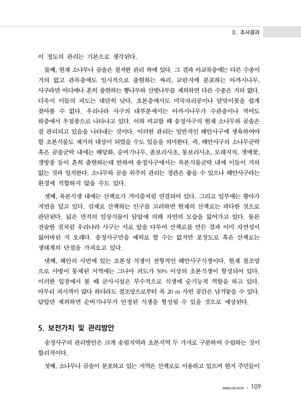 Ⅱ. 조사결과 www.nie.re.kr ? 109 이 정도의 관리는 기본으로 생각된다. 둘째, 현재 소나무나 곰솔은 철저한 관리 하에 있다. 그 결과 아교목층에는 다른 수종이 거의 없고 관목층에도 일시적으로 출현하는 싸리, 교란지에 분포하는 아까시나무, 사구라면 어디에나 흔히 출현하는 뽕나무와 산벚나무를 제외하면 다른 수종은 거의 없다. 더욱이 이들의 피도는 대단히 낮다. 초본층에서도 미국자리공이나 달맞이꽃을 쉽게 찾아볼 수 없다. 우리나라 사구의 대부분에서는 아까시나무가 수관층이나 적어도 하층에서 우점종으로 나타나고 있다. 이와 비교할 때 송정사구의 현재 소나무와 곰솔은 잘 관리되고 있음을 나타내는 것이다. 이러한 관리는 일반적인 해안사구에 생육하여야 할 초본식물도 제거의 대상이 되었을 수도 있음을 의미한...