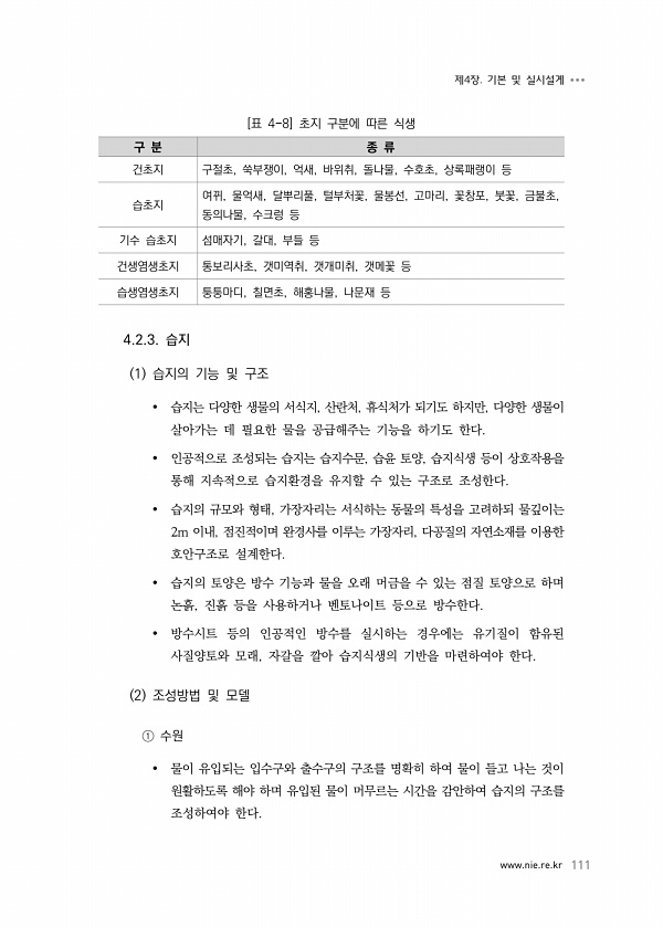 www.nie.re.kr 111 제4장. 기본 및 실시설계 [표 4-8] 초지 구분에 따른 식생 구 분 종 류 건초지 구절초, 쑥부쟁이, 억새, 바위취, 돌나물, 수호초, 상록패랭이 등 습초지 여뀌, 물억새, 달뿌리풀, 털부처꽃, 물봉선, 고마리, 꽃창포, 붓꽃, 금불초, 동의나물, 수크렁 등 기수 습초지 섬매자기, 갈대, 부들 등 건생염생초지 통보리사초, 갯미역취, 갯개미취, 갯메꽃 등 습생염생초지 퉁퉁마디, 칠면초, 해홍나물, 나문재 등 4.2.3. 습지 1 습지의 기능 및 구조 습지는 다양한 생물의 서식지, 산란처, 휴식처가 되기도 하지만, 다양한 생물이 살아가는 데 필요한 물을 공급해주는 기능을 하기도 한다. 인공적으로 조성되는 습지는 습지수문, 습윤 토양, 습지식생 등이 상호작용을 통해 지속적으로 ...